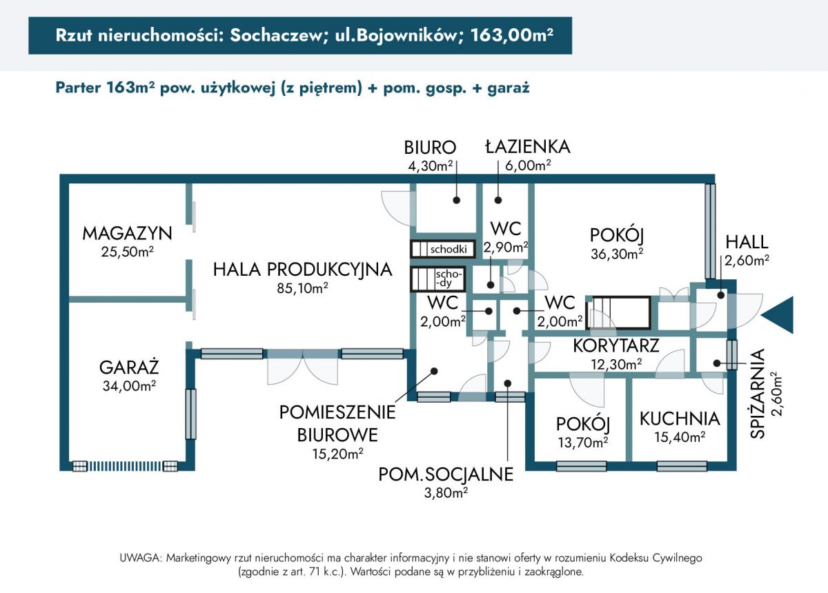 Do domu przylega hala z pomieszczeniami biurowymi i garażem, co daje możliwości generowania dodatkowych dochodów.