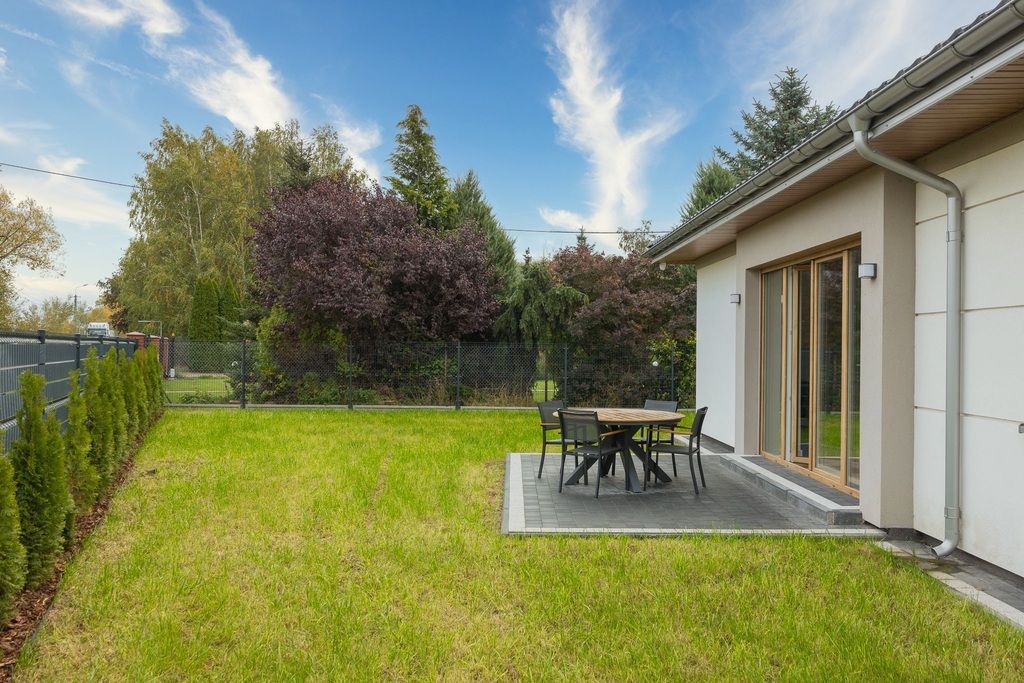 Taras przylegający do salonu tworzy kameralną przestrzeń do wypoczynku, a ogród zapewnia prywatność i spokój.