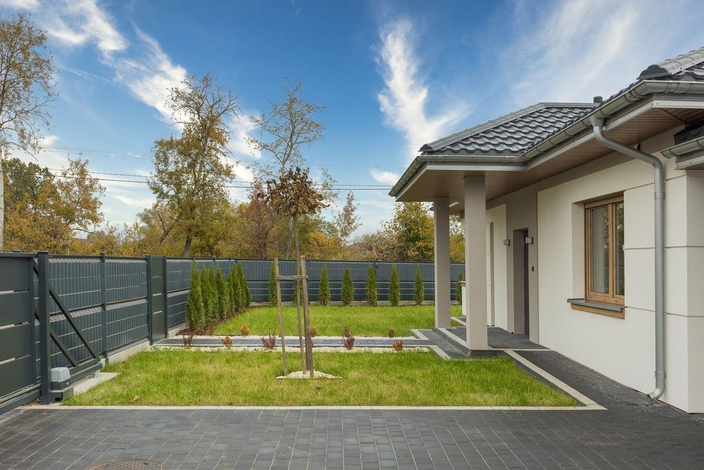 Działka o powierzchni 633 m² jest w pełni ogrodzona, z podjazdem i dojściem z kostki oraz automatyczną bramą wjazdową.