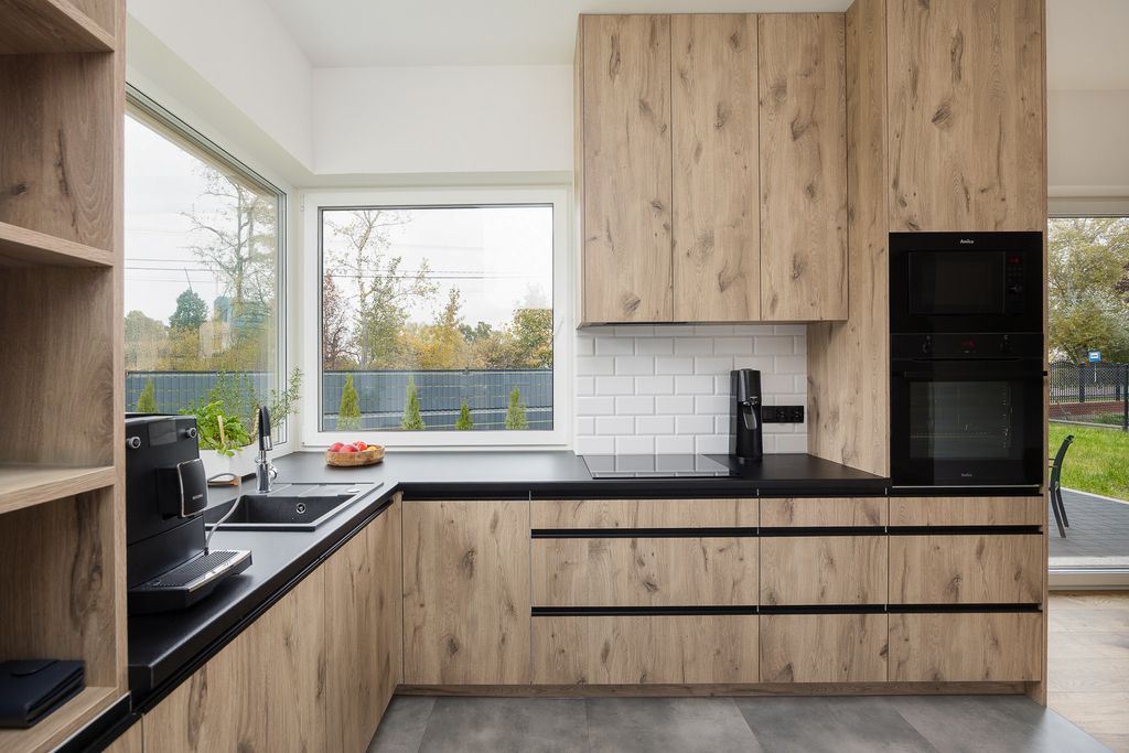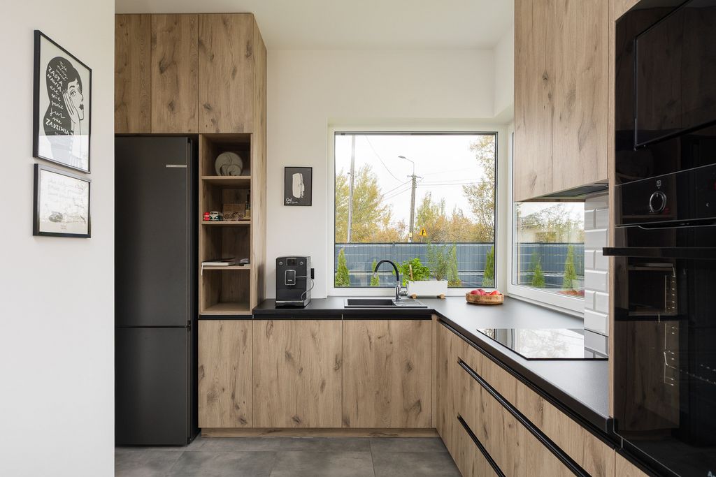 Centralną część stanowi jasny salon z wyjściem na taras, połączony z otwartą kuchnią wykonaną na wymiar przez stolarza i wyposażoną w wysokiej klasy sprzęty marki Bosch. Tuż obok znajduje się praktyczna spiżarnia.