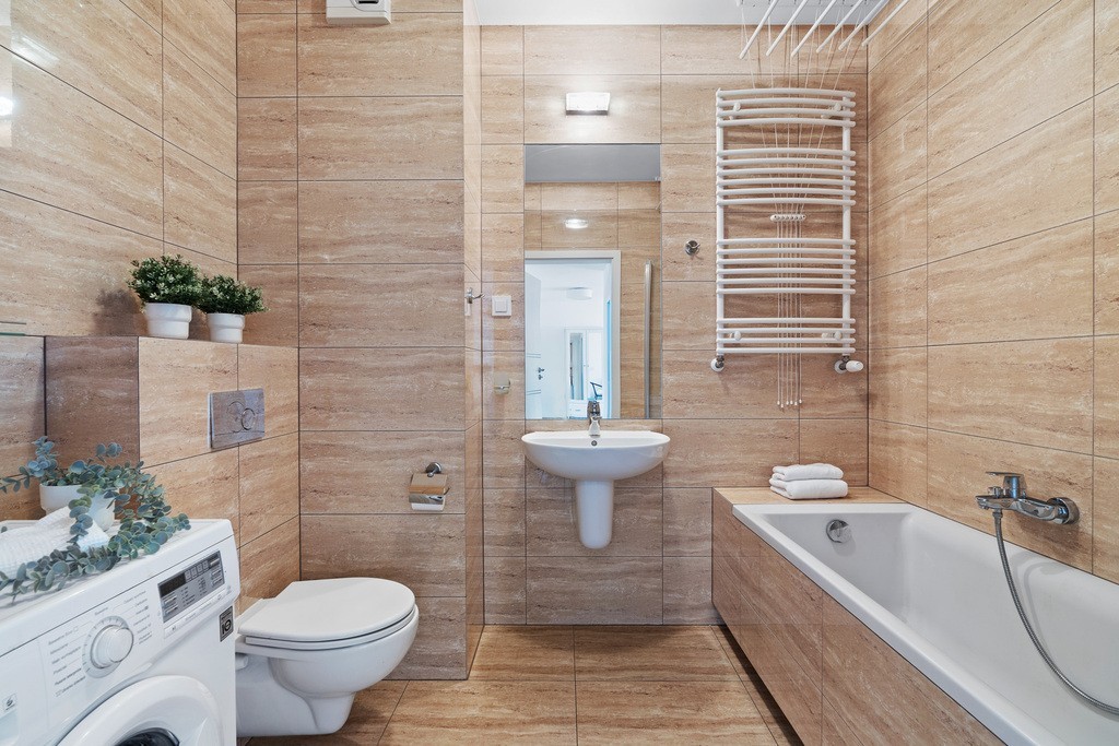 - Łazienka wyposażona w wannę z zabudową prysznicową