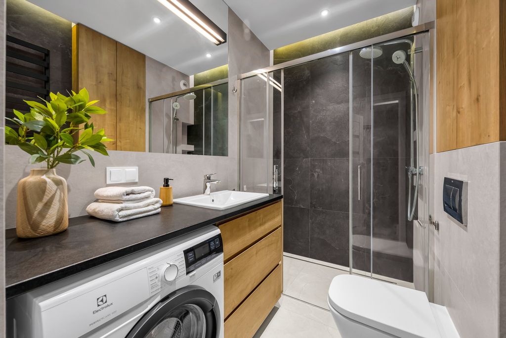 Kuchnia nie udaje, że jej nie ma – jest pełnoprawna, wygodna i zaprojektowana tak, by naprawdę się w niej gotowało, a nie tylko podgrzewało kawę. Zabudowy meblowe wykorzystują każdy centymetr przestrzeni, oferując zaskakująco dużo miejsca do przechowywania. Wysokiej klasy materiały, solidne wykończenie i spójna estetyka sprawiają, że od progu czuć jakość – tę prawdziwą, nie katalogową.