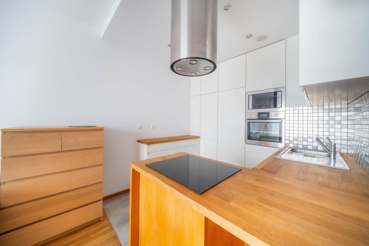 Sprzęt renomowanych marek: pralka, lodówka, zmywarka, mikrofalówka, płyta indukcyjna, okap - wszystko gotowe do użytkowania.