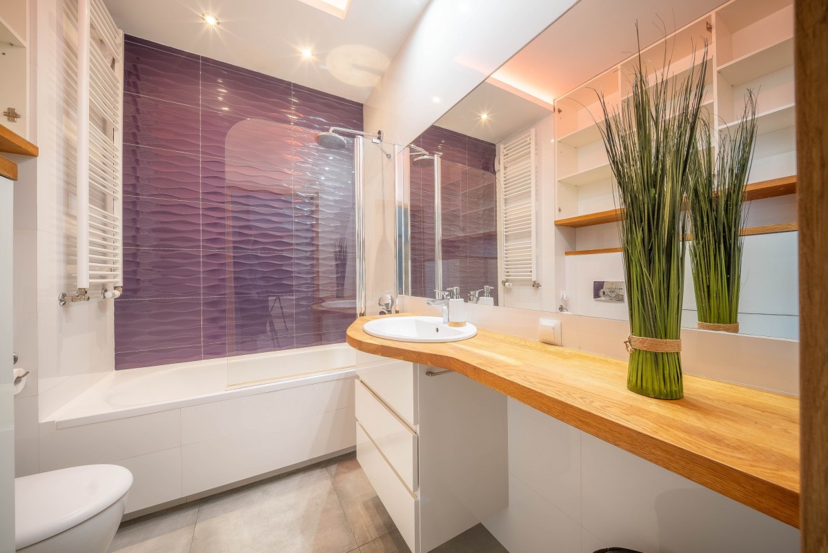 Przemyślana zabudowa łazienki z dużą ilością miejsca do przechowywania