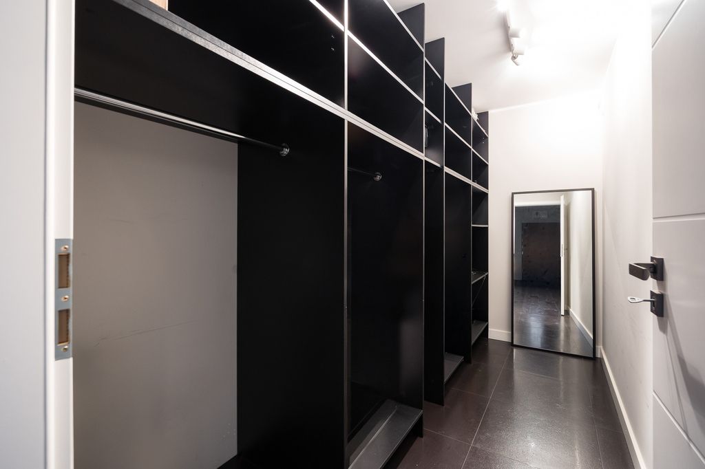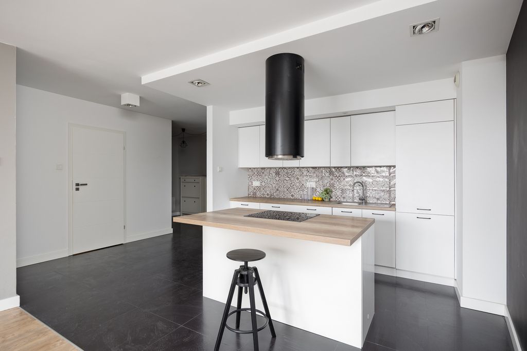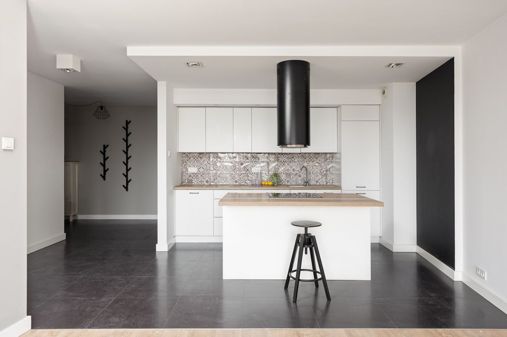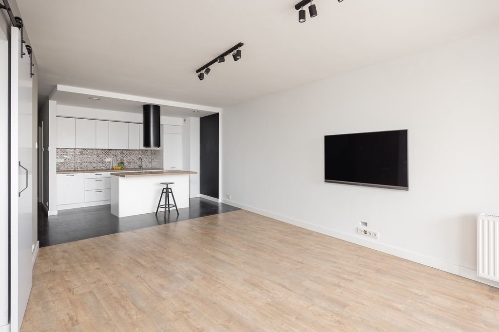 Wysoka na 2,6m nieruchomość charakteryzuje się otwartym planem z salonem i aneksem kuchennym wyposażonym w wyspę oraz charakterystyczny, czarny okap. Część dzienną od sypialni oddzielają białe, przesuwne drzwi, a podłogi wykończono panelami w kolorze naturalnego drewna i ciemnymi kaflami. Wnętrze jest jasne dzięki dużym przeszkleniom balkonowym i utrzymane w kontrastowej, czarno-białej kolorystyce.