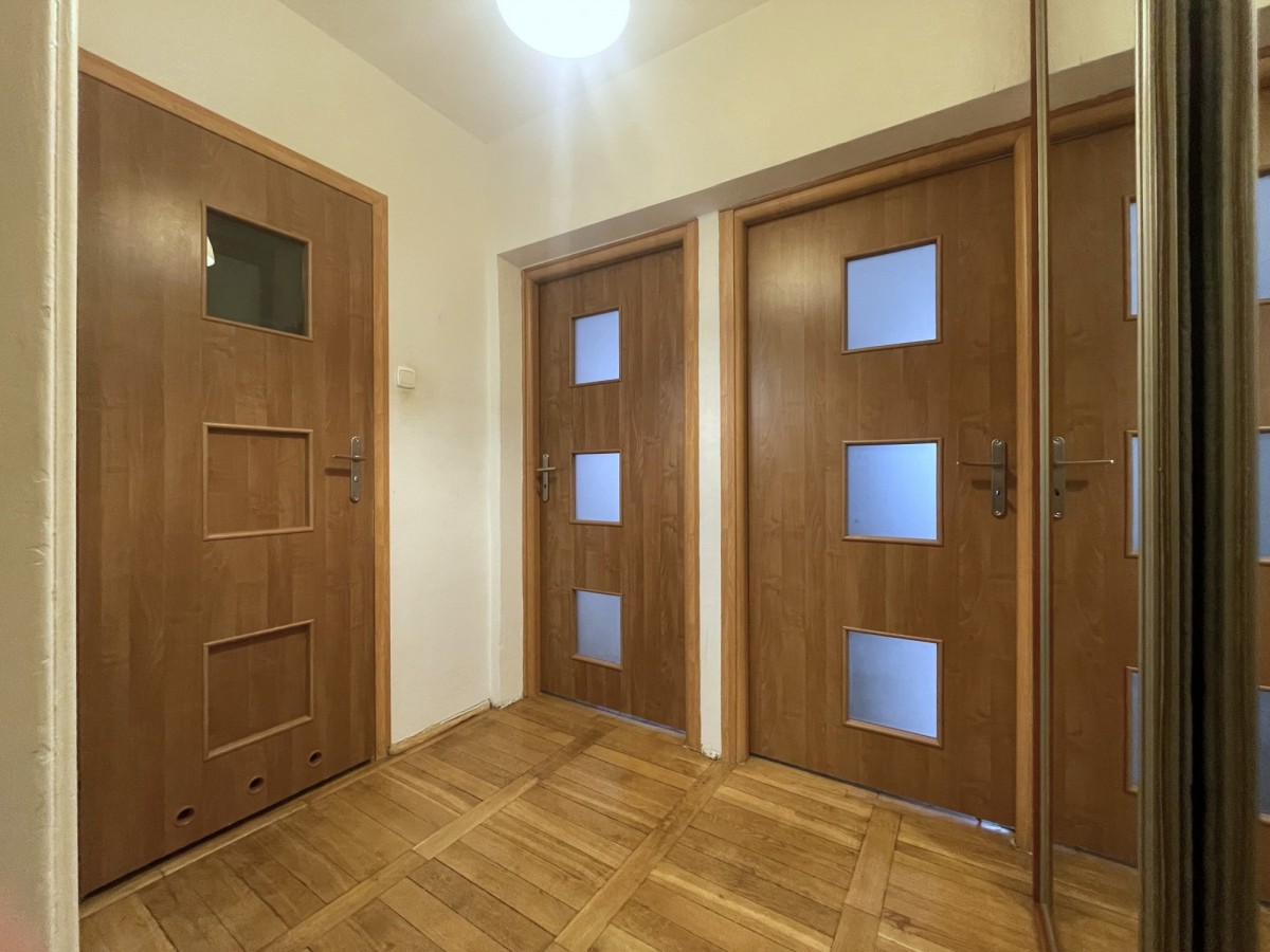 Mieszkanie wymaga odświeżenia, jednak zachowany został oryginalny dębowy parkiet, który może stać się ozdobą wnętrza po renowacji. Kuchnia została już odświeżona, wyposażona w nowe meble i część sprzętu AGD.