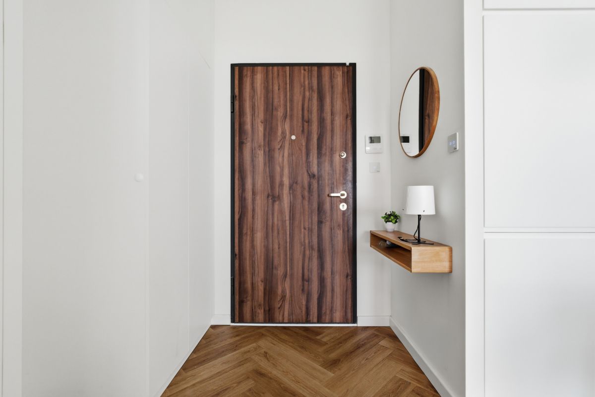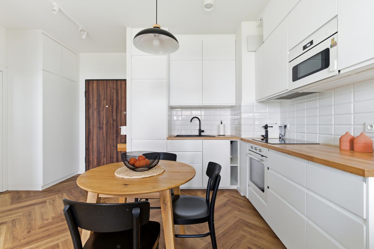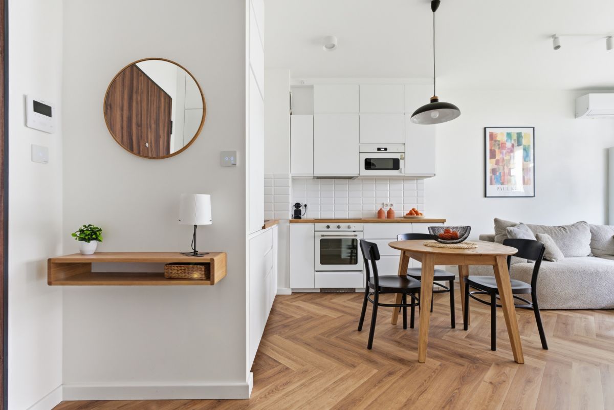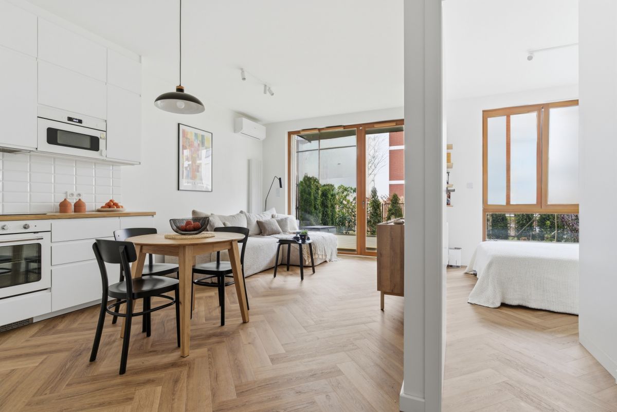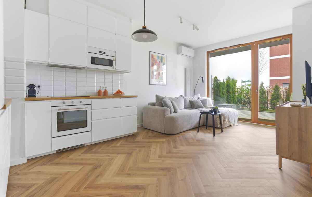 W całym mieszkaniu zastosowano wysokiej jakości panele winylowe ułożone w elegancki wzór: