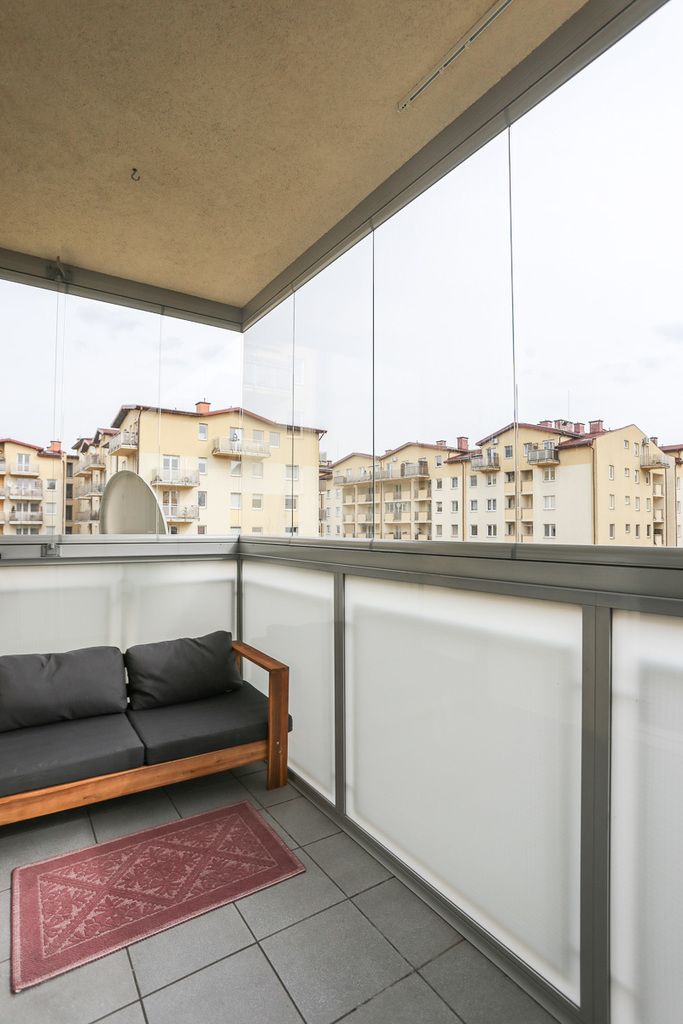 Strefa dzienna to duża i ustawna przestrzeń z sofą, stolikiem kawowym, szafką RTV oraz dodatkowo stołem jadalnianym. Mamy tutaj również wyjście na oszklony balkon gdzie swobodnie mieści się stolik i krzesła i nadal mamy dużo przestrzeni.